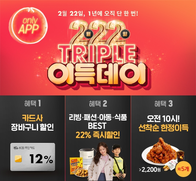 트리플 ‘2’(이)득데이는 22일 단 하루 이랜드몰 모바일 애플리케이션을 통해 참여할 수 있으며, 리빙/패션/아동 등 패션 카테고리와 식품 카테고리에서 가장 인기 있는 300가지 상품의 가격을 22% 즉시 할인해준다.