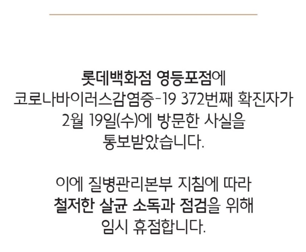 롯데백화점 공지사항을 통해 372번째 환자가 19일 영등포점 지하 1층 등을 다녀갔다는 사실을 통보받았다고 전했다. 이에 롯데백화점은 영등포점 긴급 휴점하고 방역 작업을 할 계획이다.